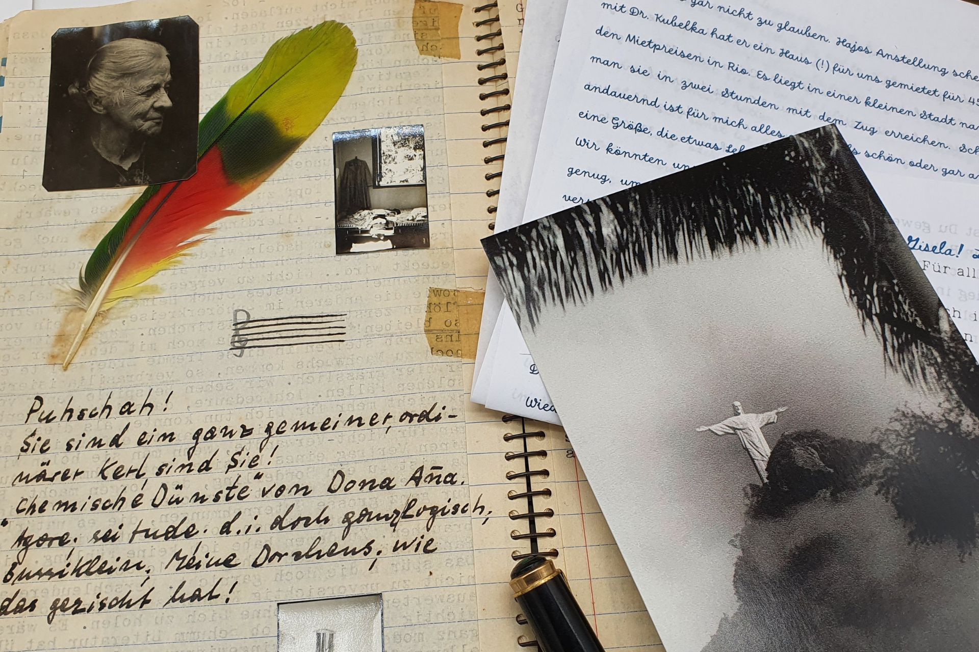 Erinnerungsseite an Dona Anna, die chemischen Dünste und ihre sprechenden Papageien in den Aufzeichnungen von Hajo und Christine. Das kleine Foto zeigt das Zimmerchen der beiden mit dem Fenster zum Baum. Hier Fotos zu entwickeln war sicher ein Abenteuer.